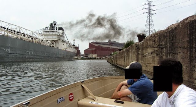 However, the oxbow looked a little murky, but more importantly the bridge to the island looked a little too low for us to pass under. Perhaps we could enter the passage from the north end of the island. We noticed a huge plume of smoke just beyond the Dix Avenue drawbridge, rising from what could only be the smokestack of a very large ship in Ford's turning basin. I sped up to investigate.