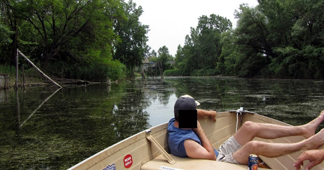 Kayaking seems to be catching on around here more than ever, and with it a flood of pictures and stories from people using them to explore Detroit's lesser known waterways and nautical secrets. The publication of the book Up The Rouge! has likewise increased interest. Since I don't do kayaks, I have a small motorboat with an extremely shallow-draft outboard, which allows me to go almost anywhere a kayak can. And I can carry a lot more beer. Another thing kayakers often don't do is get out of their boat to go on land and take photos, which is no problem for me.