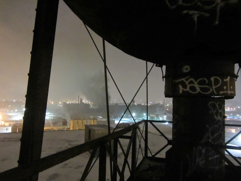The other reason I climbed into this hellhole was to hopefully get a good glimpse of the Fisher Body Plant #10 fire from the watertower, which was still raging at the time: