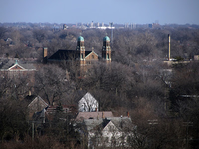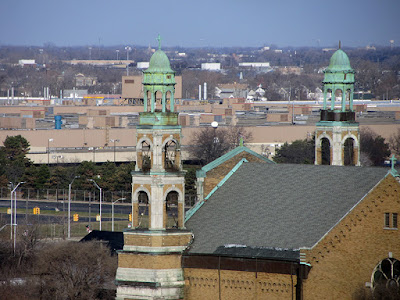 Here is St. Hyacinthus Church, with the Chrysler Jefferson East Assembly Plant and the Winston Hotel in the far distance: